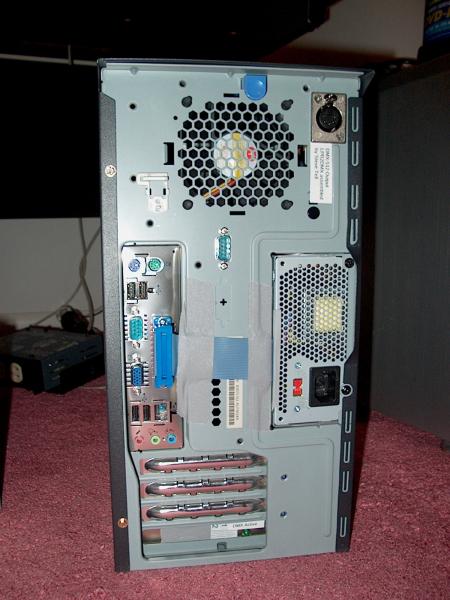 Even this IBM Netvista "mini-tower" has plenty of bare sheet metal just waiting to be punched for the 5-pin female XLR connector. There already was a hole in that location: a serious-looking case-security key lock, just begging to have its keys lost forever in a dark corner of the theater. The lock came out easily, an a greenlee punch enlarged and rounded out the hole to fit the XLR.